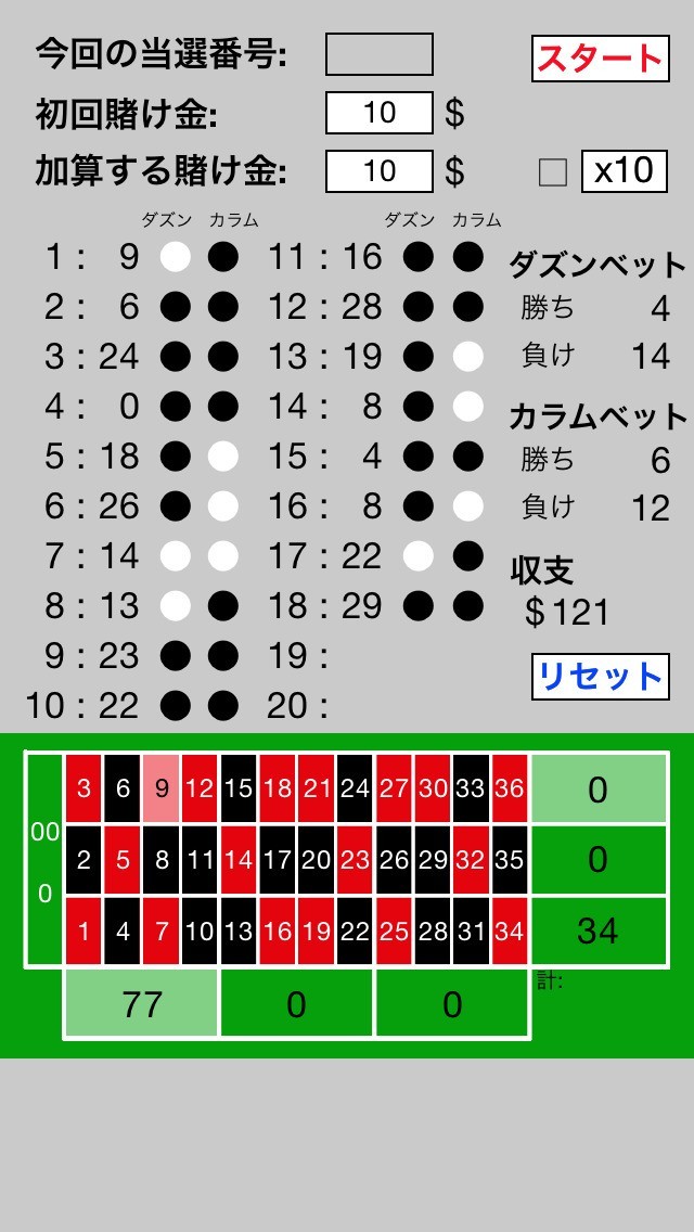 ルーレットのカラム(縦一列12点賭け)とダズン(1ダース12点賭け)にマーチンゲール法を応用しベットするためにベッティングシステムツールです。