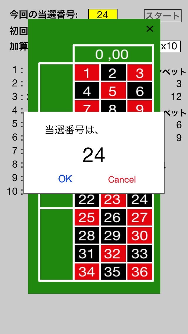 マーチンゲル法は、賭けにハズレたとき、次に賭けるときは、その損失を取り戻すためより多くの金額を賭け続けるリスクの高いベット方法ですが、このアプリでは、設定した賭け金に応じて、最適な金額を計算し賭ける場所を表示します。