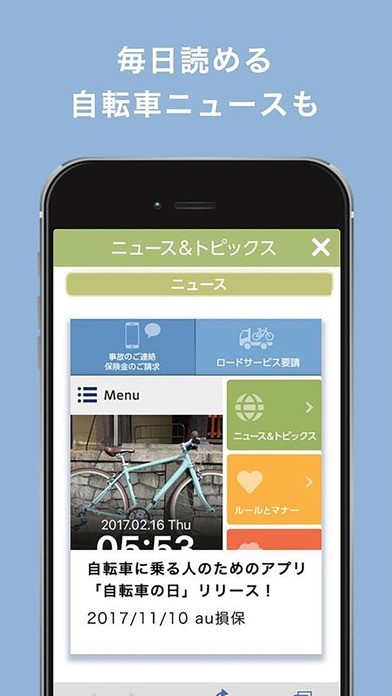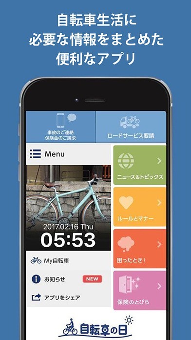 自転車をもっと便利に、安全に楽しむことが出来るようになるアプリが「自転車の日」です。自転車に関する最新の情報を毎日配信しているのでiPhoneで気軽にチェックすることが可能となっているだけでなく。MY自転車機能で自分の自転車の防犯登録番号や型式などを登録しておくことで万一盗難などにあってしまったときにもスムーズに被害届を提出することが出来るようになっています。また対象となっている自転車保険に加入しているユーザーであれば転車ロードサービス要請機能によって、GPS機能を利用することで自分の現在地までロードサービスを要請することが出来ます。