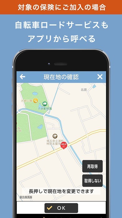 対応している保険に加入している場合には、自転車のロードサービスをアプリから要請することができるようになっていて、GPS機能を利用して正確な位置情報を知らせることができます。