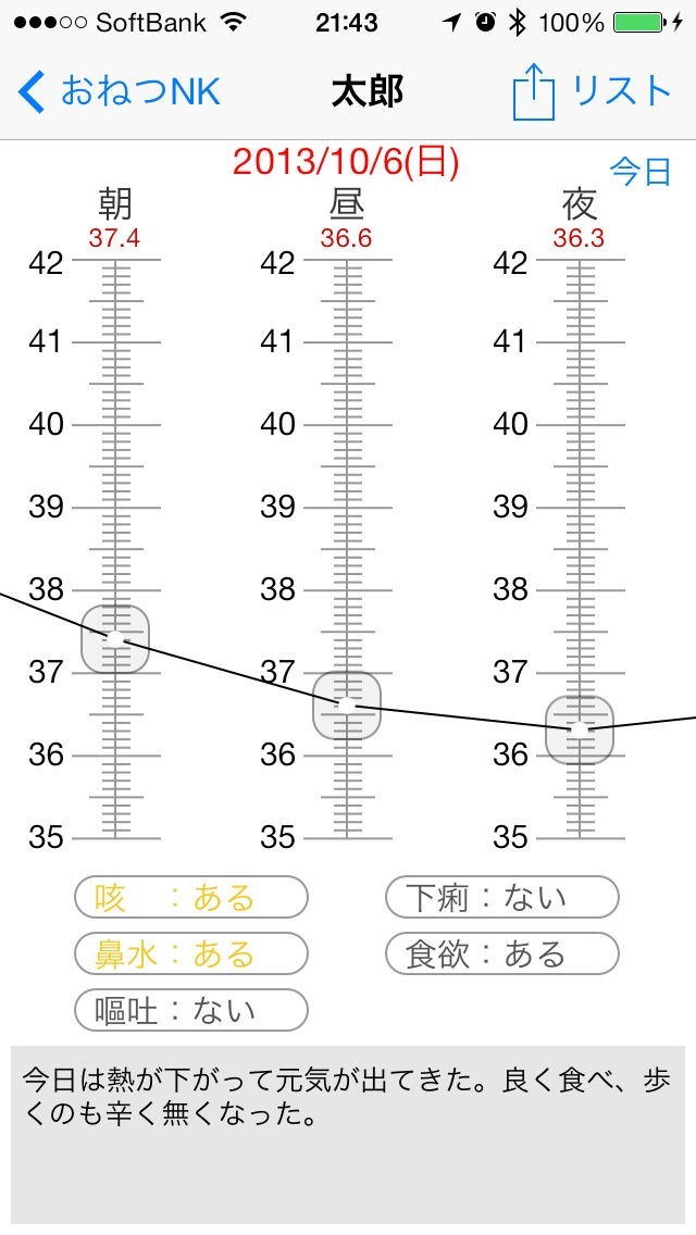 『おねつNK』ではその日の体温だけでなく朝昼晩の3回の記録を残しておけるので何日前のいつの時間帯から熱が出ていたとか咳や鼻水といった観察してわかる症状を一緒に記録しておけるアプリになっています。