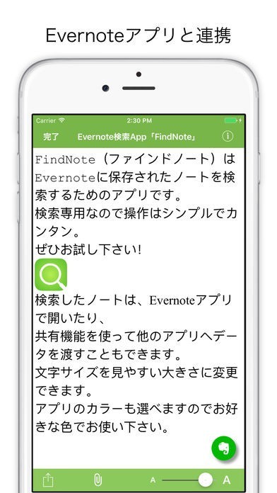Evernoteを利用してノートを作成しているとファイル数が増えるにつれて検索が面倒になってきます。しかし、本アプリを使えばURLスキームを介してお目当てのページが見つけやすくなります。