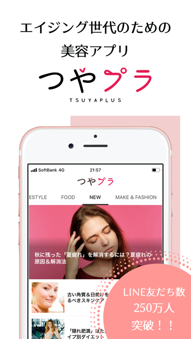 App Storeより引用「つやプラ」は、40代からの女性が抱える幅広いエイジングの悩みに対する解決策、前向きに年を重ねていくための美容・健康情報を毎日お届けします。