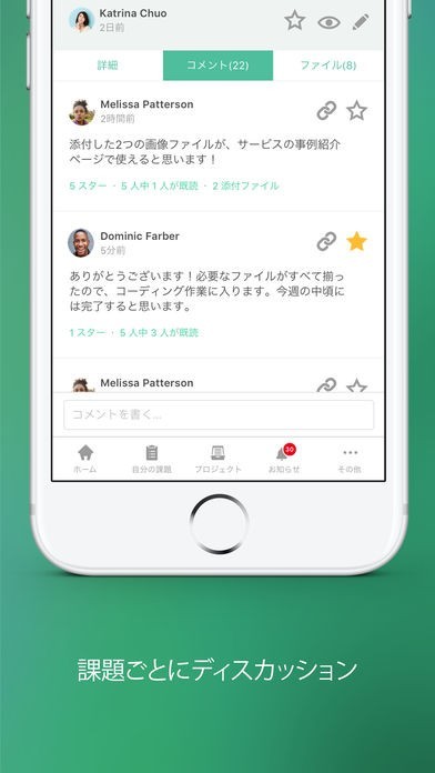 コメントスレッドでプロジェクトに対する意見や提案を行うことができるようになっているので、プロジェクトの進捗管理とコミュニケーションを同一のアプリで行うことが可能です。