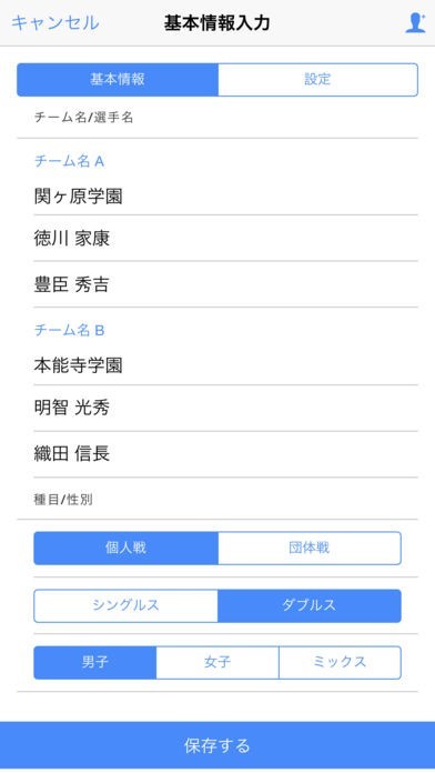 選手名を登録して参加者の多い大会のような記録を行うこともできます。シングルにダブルスはもちろん、男女別やミックスなども対応しています。さらに個人と団体も分けて記録することが可能です。
