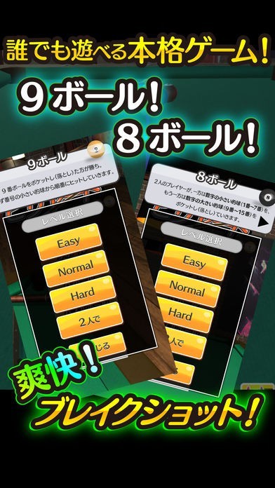 対戦相手の強さを調整できるので、自分のレベルにあったゲームができます。友達との二人対戦もできます。一人で技術を磨くもよし、二人で心行くまでビリヤードを楽しむのもよしです。
