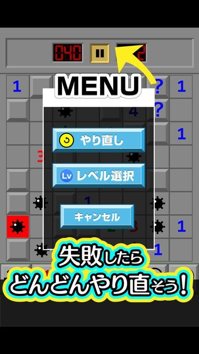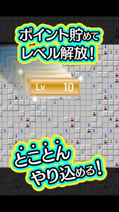 このアプリでは、ゲームをクリアするごとにポイントを手に入れることができます。ポイントが貯まるとプレイヤーはレベルアップし、それとともにフィールドの広さや地雷の数も増えていきます。