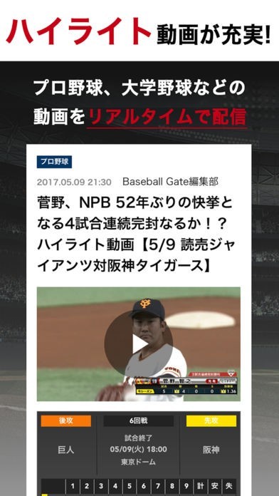 このアプリでは、野球に関する記事だけでなく、プロ野球、大学野球などの公式戦のハイライト映像を見ることができる機能も付いているため、どのような試合になったのかしっかり確認することができます。