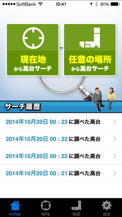 「高台サーチ」は、GPSで現在の位置を検索し、それよりも標高が高い場所を教えてくれるアプリです。津波が起こるとより高い場所へ逃げる必要がありますが、普通の地図アプリでは標高までは表示されません。このアプリならより高い場所を色付きで表示してくれるので、津波からの避難に適した場所がすぐに見つかります。