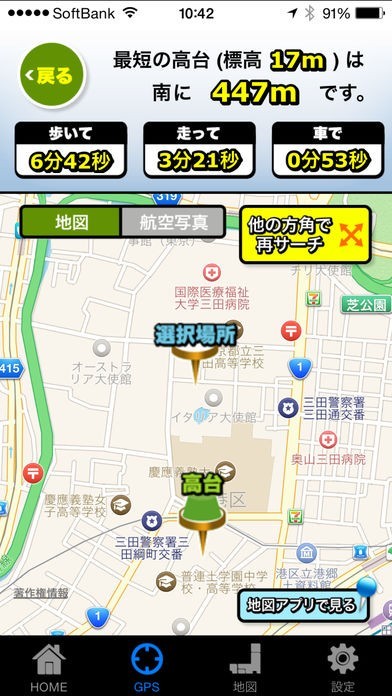 今いるところから簡単に高台を探せるので、津波警報が出たときに安心できます。