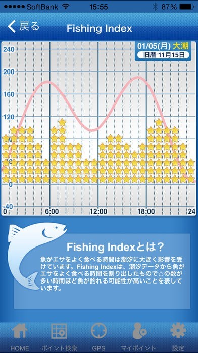 日本全国700箇所のタイドグラフを収録。独自の魚のとれやすさ指数も。