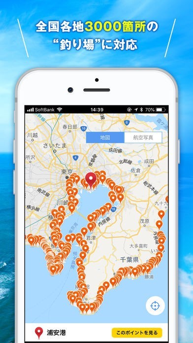 このアプリでは、通常の地図に加え、航空写真を含めた2種類から釣り場情報が探せます。いずれもピンポイントで探せるので、マイナーな釣り場情報も手に入るのが特徴です。