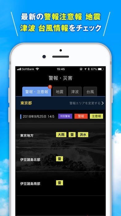 釣りやダイビングを楽しんでいる時、仮に天候が悪化した場合でもアプリで警報を知らせてくれます。波浪警報や高潮警報と言った重要な災害情報が届くので、安心してレジャーが楽しめます。