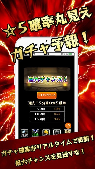 時間ごとの星5がでる確率を表示してくれます。これにより、どのタイミングでガチャを回していいかの目安になります。高レアを狙いたいときは、アプリを参考にする事が出来ます。