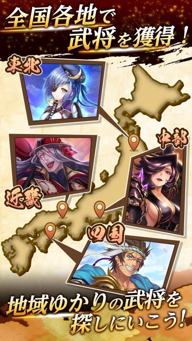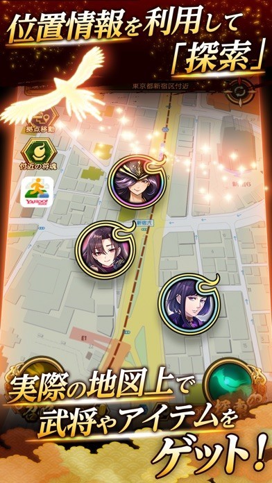 このゲームでは、武将やアイテムは現実の地図上に散らばっています。地図上に存在する魂のカケラを集めることで、武将をゲットすることが可能です。地方ゆかりの名将が登場することもあるので、ぜひ各地に脚を伸ばして武将を探してみてください。