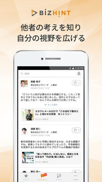 「BizHint HR 人事・人材領域専門ニュースアプリ」は、ビジネスに関する情報を主に配信しているニュースアプリです。 人材育成やキャリア、労務といったキーワードに関連した記事を手軽に閲覧可能。 検索機能を利用すれば、気になる記事を手軽に発見することができます。 また、編集部が厳選したニュースを毎日配信しており、ここでしか読めない経営者インタビューなども充実しているのが特徴です。