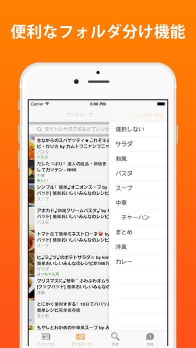 App Storeより引用クックマークはクックパッド等のレシピサイトで見つけたお気に入りのレシピをブックマークして、フォルダ分け・タグ付け・検索できる無料アプリです。