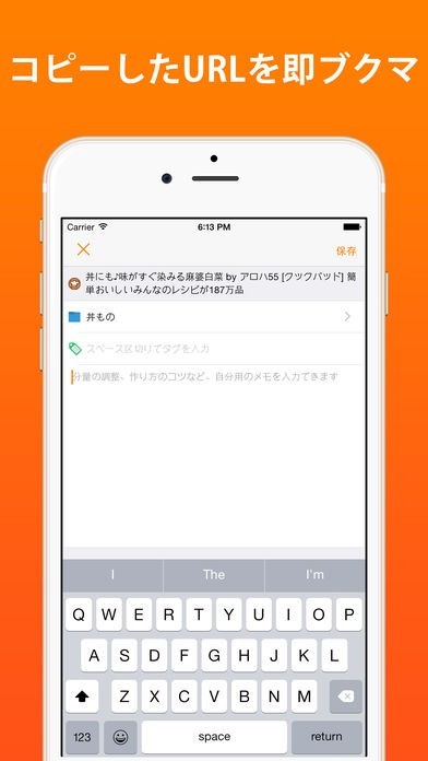 レシピサイトのURLをコピーしてクックマークを開けば、レシピの登録画面が開きます。ブラウザで素敵なレシピを見つけたら、URLをコピーしてクックマークを開いてください。
