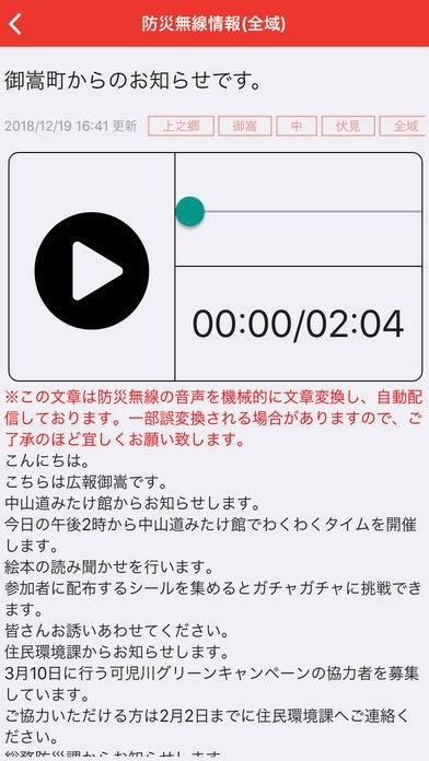 防災無線から放送された内容を音声と文章で確認できます。