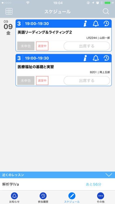 時間割や過去の出欠記録は、アプリでいつでも確認できます。