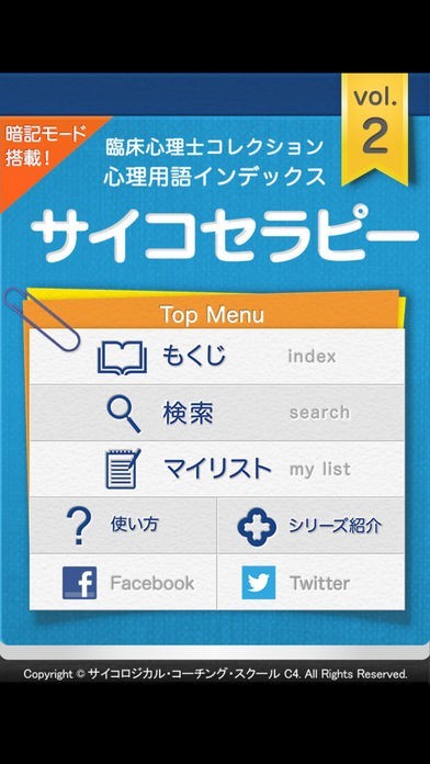 App Storeより引用臨床心理士の試験対策支援アプリ第2弾「臨床心理士コレクション心理用語インデックスvol.2 サイコセラピー」です。各種心理療法を中心に、試験に頻出されるキーワードを収録しました。