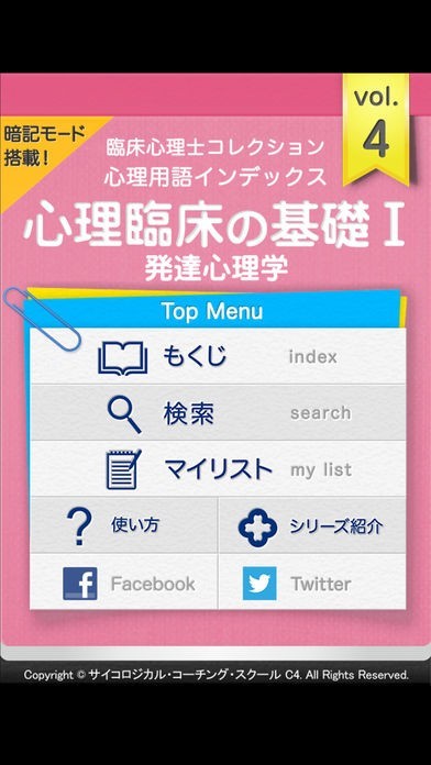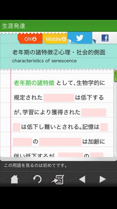 暗記モードを利用すると、うろ覚えになっている心理臨床で使われる語句や事柄を効率よく覚えていく事ができます。重要語句が隠れていて、タップすると語句が浮かび上がるようになっています。
