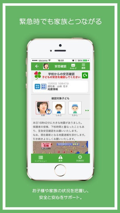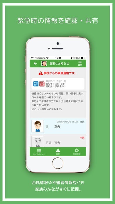例えば、台風による休校連絡や地域の不審者情報などをスマホで受け取ることや 登録された家族の未読・既読状況を確認することもできます。