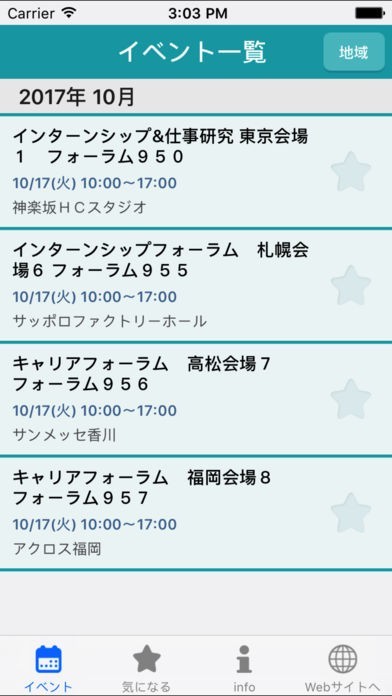 全国で年間約200回開催されているキャリタス就活フォーラムのイベントスケジュールや当日出展企業情報の検索・閲覧、開催地域ごとの絞り込み機能で、最寄りのイベント情報を簡単に検索できます。