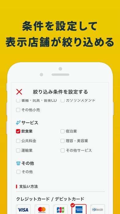 還元率、加盟店種別(カテゴリー)、決済手段について自分に合う条件を設定することで、地図上に表示する加盟店を絞り込むことができます。