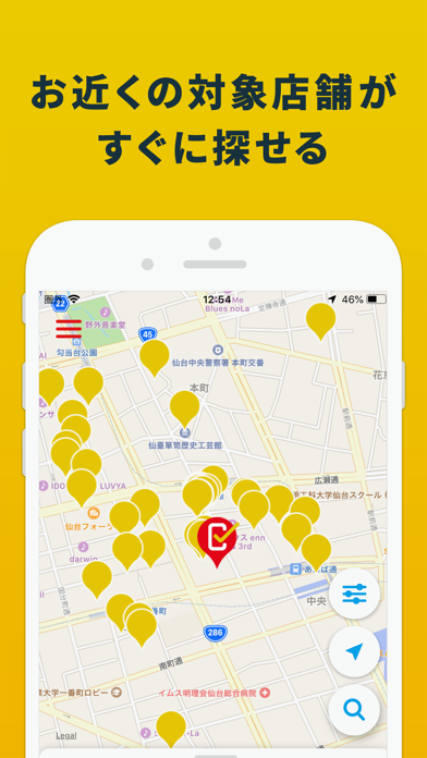 地図上の操作で、現在地から対象店舗を見つけることができます。