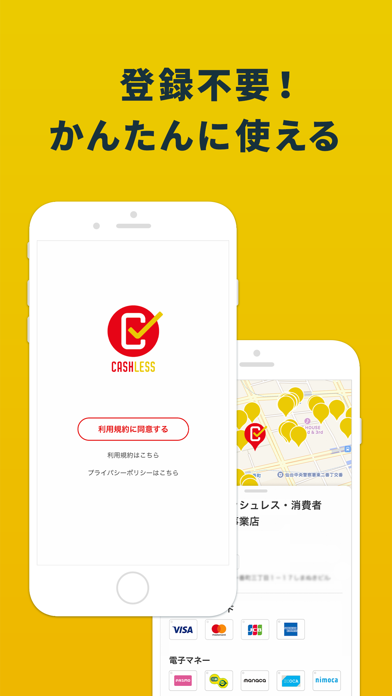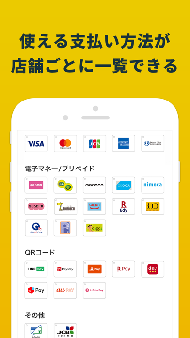 A.各店舗の対象決済手段は、店舗ごとに異なります。本アプリで対象決済手段を確認できます。また、公式ホームページの地図機能や店頭のポスターに記載のロゴで確認することができます。