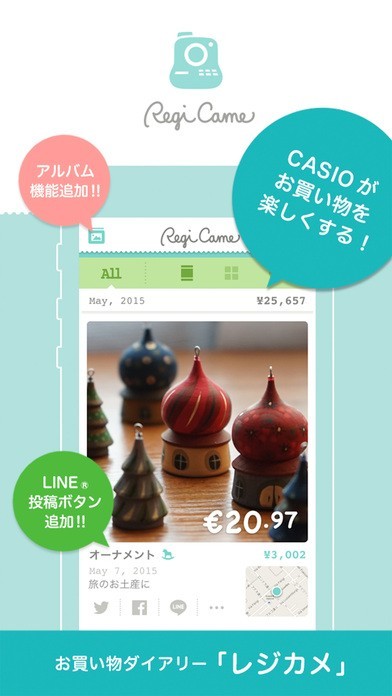 レジの要領で、カメラの上で値段を入力してシャッターを押すだけ!買った物の、「値段」「写真」「位置情報」が一度にカンタンに記録できます!