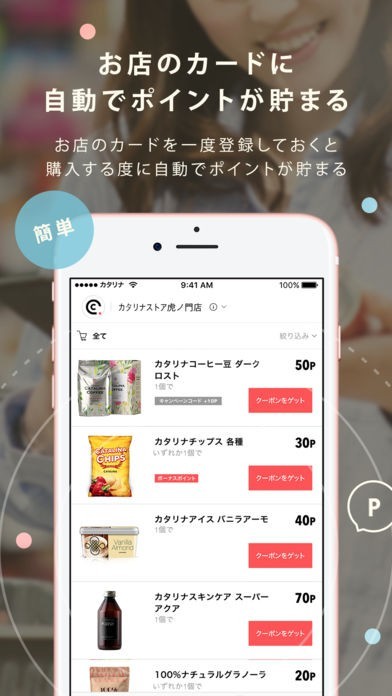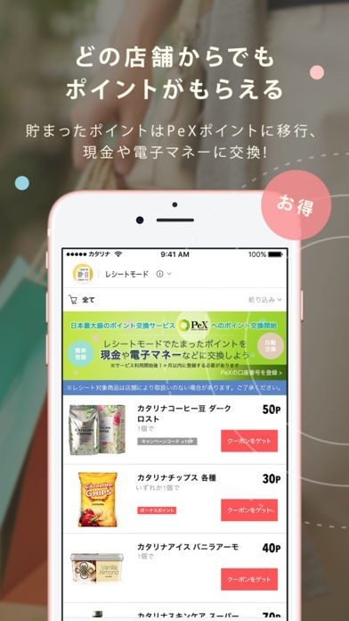 「スマートクーポン - カタリナ」は普段のお買い物でポイントをもらってお得にお買い物を楽しむことができるようになるアプリです。カードモードでは利用したいお店とポイントカードを登録することでお買い物をすると後日ポイントを貰うことが出来るようになっていて、レシートモードでは購入時のレシートを撮影して送信することでポイントを貰うことが可能です。