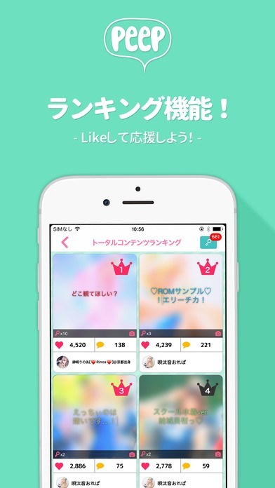 「peep」は同人で活躍するコスプレイヤーや声優たちが多く投稿しているSNSアプリで、顔写真やボイスを聞くことができます。良かった作品は他のSNSと同じLikeやコメントをしてコミュニケーションをとってみてください。カテゴリはコスプレやボイス日記など複数に分かれていて探しやすく、特にお目当てのものがないときはランキングや新着で目についたものを選ぶのもありです。画像は指でなぞると判明するスクラッチ形式で、閲覧や視聴は有料のカギが必要ですが毎日無料のログインボーナスやルーレットでいくつかももらえます。お気に入りに絞って見るのであれば課金する必要はありません!