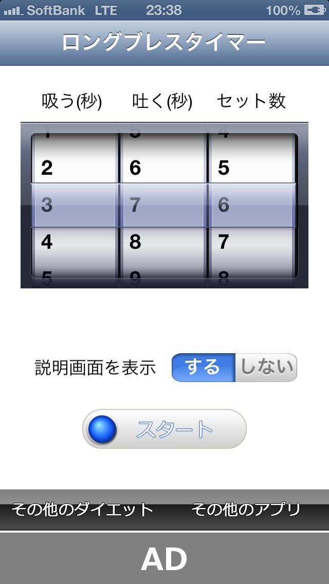 ロングブレスダイエットの吸う秒数、吐く秒数、セット数を設定できる!