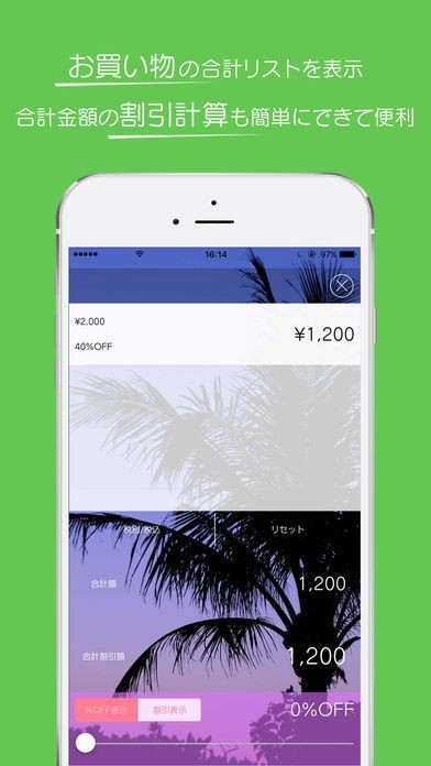 買い物モードでは、買いたい物の金額をリスト表示できます。割引計算も簡単にできます。