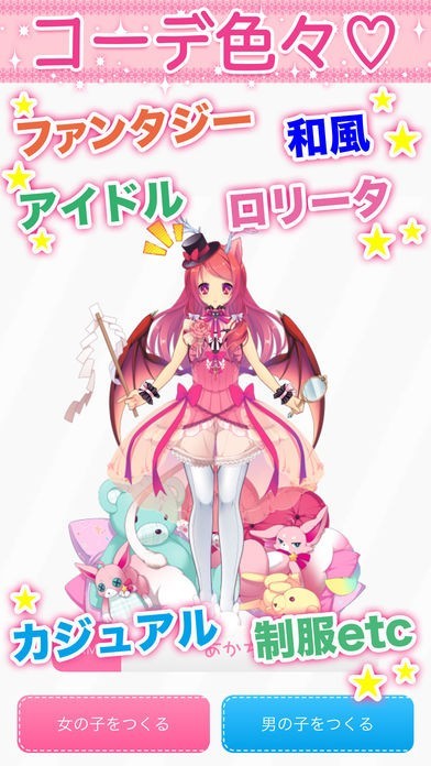 WEB版で30万ダウンロードの人気ゲームが、アプリになった着せ替え・アバタ―作成ゲームです。可愛い女の子キャラからカッコいい男の子、アイドルやメイドさん、学生から武将まで様々な服装パーツが用意されています。世界で一つのキャラクターを自分好みに着せ替えすることができます。顔と体、表情なども自由に変えられます。小物や背景も選べ、世界観も作れるので、本格的な着せ替え・アバタ―を作りたい人にピッタリです。