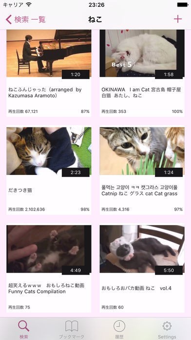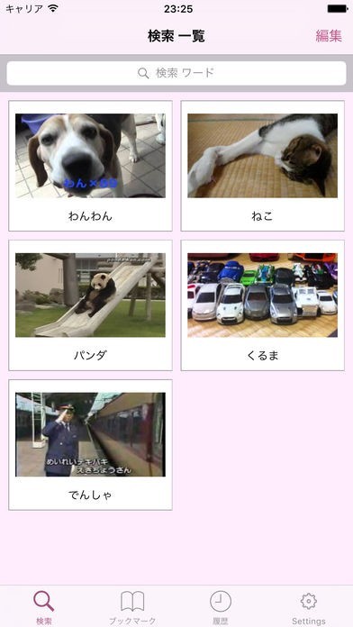 保存した検索キーワードはサムネイルと共に表示されるので、まだ文字を読めないお子様でも好きな動画の検索結果を選ぶことができます。