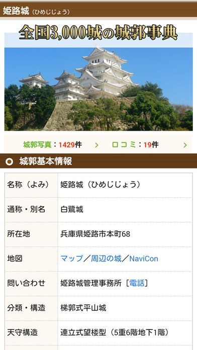 日本全国3,000城の、基本データ・写真・口コミを閲覧できます。口コミは1万件以上、お城の写真は15万枚以上の大ボリューム。実際にお城を訪れる際の参考にして頂いたり、空いた時間に情報や写真を見て行きたい城を見つけたり、さまざまな目的でお楽しみ頂けます。
