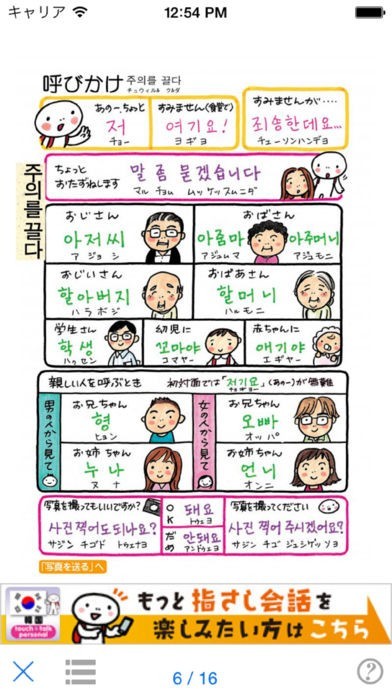 韓国語が分からないけど韓国旅行に行きたいという方に役立つのがこのアプリです。 日常的に良く使用するフレーズがたくさん入っています。 イラストも一緒に描かれているため、シーンに合ったフレーズを探しやすいです。 フレーズが見つかったら後は韓国人の方に指を差すだけ、スマホを通して会話できるようになります。 ネイティブ発音による音声も流すことが可能、韓国語の正しい発音を覚えたい時にも便利です。 使用したフレーズは履歴に残りますので、最初から探さなくて済みます。