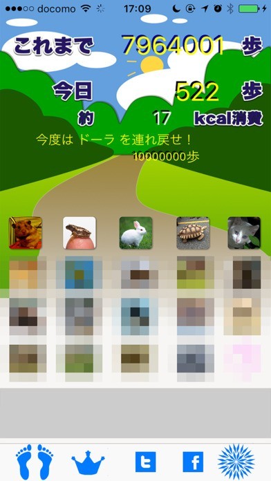 「歩数計 お帰りっ!マイペット」は、歩数計として使用して、歩数をどんどん増やしていくことで逃げ出してしまったペットたちを捕獲していくアプリです。 ペットを捕まえるという目標が設定されてあることで、単純に歩数をカウントするだけよりヤル気が上がり、歩数が増えていくごとに捕まえたペットが増えていくことで達成感も味わえます。