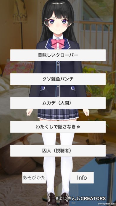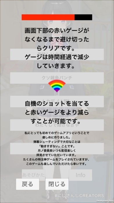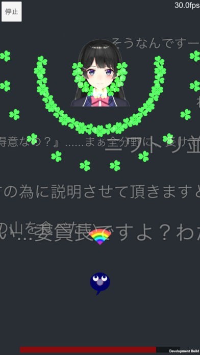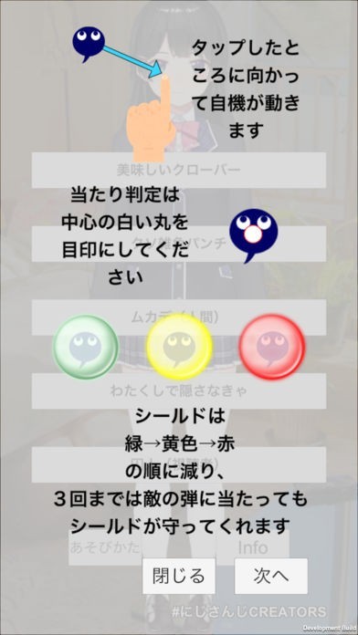 背景は、バーチャルYoutuberの信者的なコメントが背景から流れ続けます。その上に、クローバーが降り注いでくるので、タップして自分の機体を動かせば避けられます。