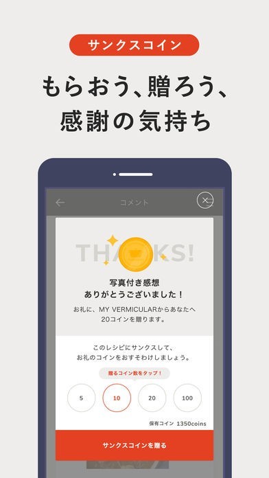 バーミキュラを使ったオリジナルレシピを投稿することもできます。レシピを投稿すると特典としてコインがもらえ、もらったコインを別のレシピ投稿者へお裾分けして幸せ気分を拡散させていく機能なども用意されています。