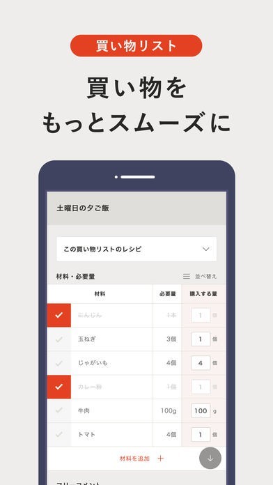 レシピに使う材料から簡単に買い物リストを作成できる機能が搭載されています。いくつかのレシピの材料を合わせた数量で買い物リストを作成することも可能で、作成したリストは家族間など他の人とも簡単に共有できるなど便利な機能が揃っています。