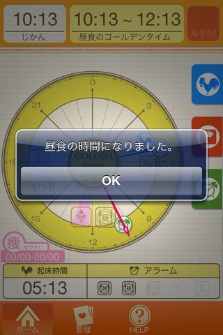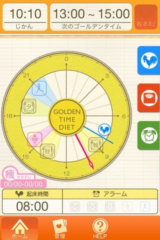 起床時刻を登録することで、その日のあなたの身体のリズムに合った、食べても太りにくい時間=「ゴールデンタイム」をアラーム機能でお知らせ!さらに女性は生理日を入力することで、痩せやすい時期がいつなのかもわかります。