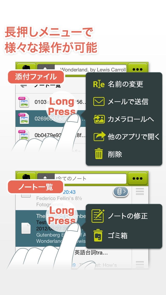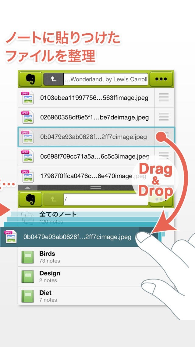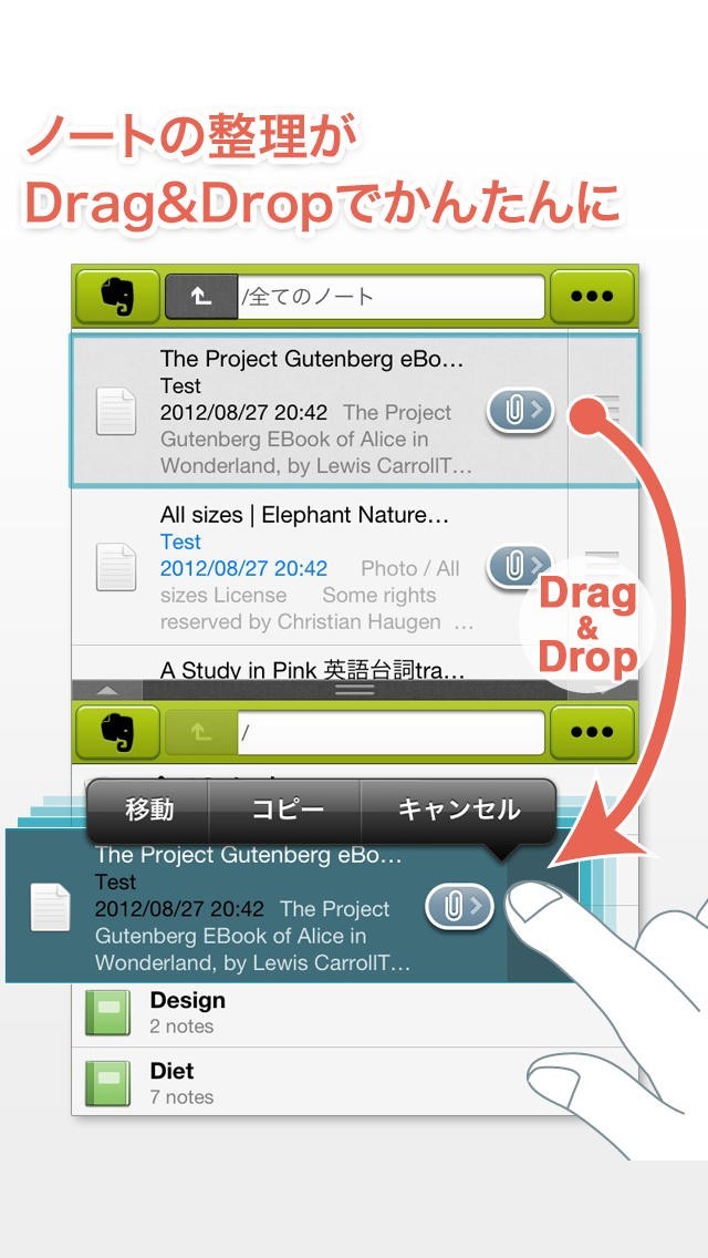 ・ファイルやノートをドラッグして目的の場所で指を離せば移動やコピーが可能な簡単操作。