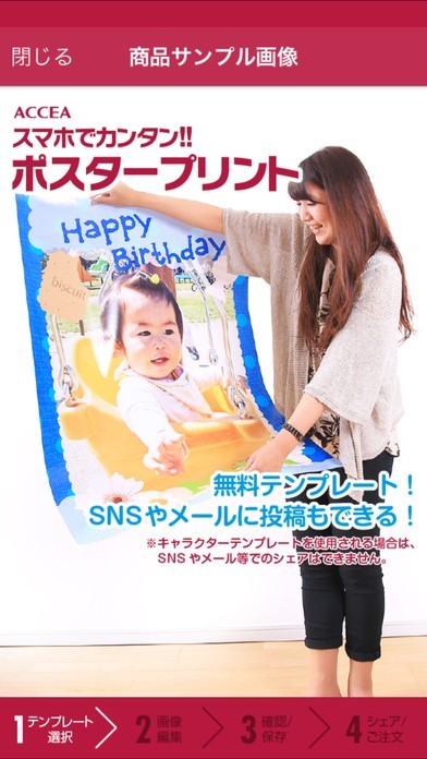「ACCEAプリント」にはスタンプによるデザイン機能が付いています。 まずはスマホに保存してある写真を選び、好みのスタンプを付けてデザインし、注文すればオリジナルグッズが手元に入ります。 レイアウトに合わせて写真の拡大や縮小も行えます。 子どもの写真を入れたポスターを自宅に飾りたい、友だちへの誕生プレゼントにしたい時に便利です。 SNSサイトにてデザインを友だちへ見せたい時に便利なのがシェア機能です。 友だちにデザインを見せて気に入ったら注文するといった使い方も可能です。 店舗別のクーポン機能も付いており、QRコードの読み取りまたは数字を入力するとクーポンによってお得になります。