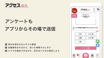 自動保存に対応している「アンケート機能」が用意されているので、隙間時間を利用してサクッと回答が行えるでしょう。説明会を実施している企業を検索出来るのもメリットですね。