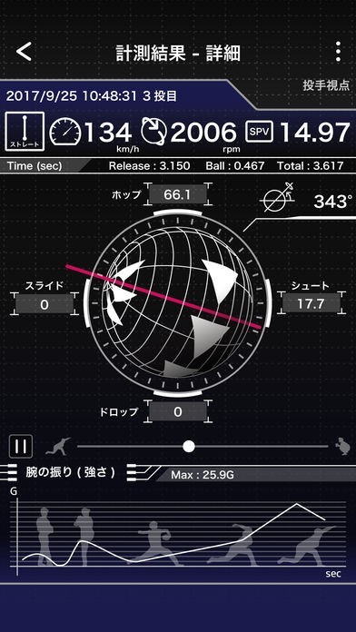 これを使う事でこれまでなんとなく投球の計測をしていたという人も独自の解析を行う事で具体的に数値化して正しい投球の計測が可能になります。ボールの回転からも具体的に確認できます。