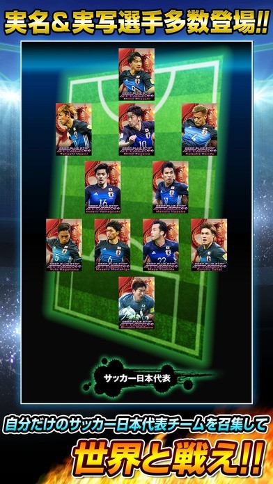 【西川周作、長友佑都、森重真人、酒井高徳、吉田麻也、本田圭佑、香川真司 、山口蛍、長谷部誠、岡崎慎司、宇佐美貴史】をはじめ多数のサッカー日本代表選手が実名実写で登場。手に入れた選手を自由に組み合わせて、自分だけのサッカー日本代表チームを作り上げよう。